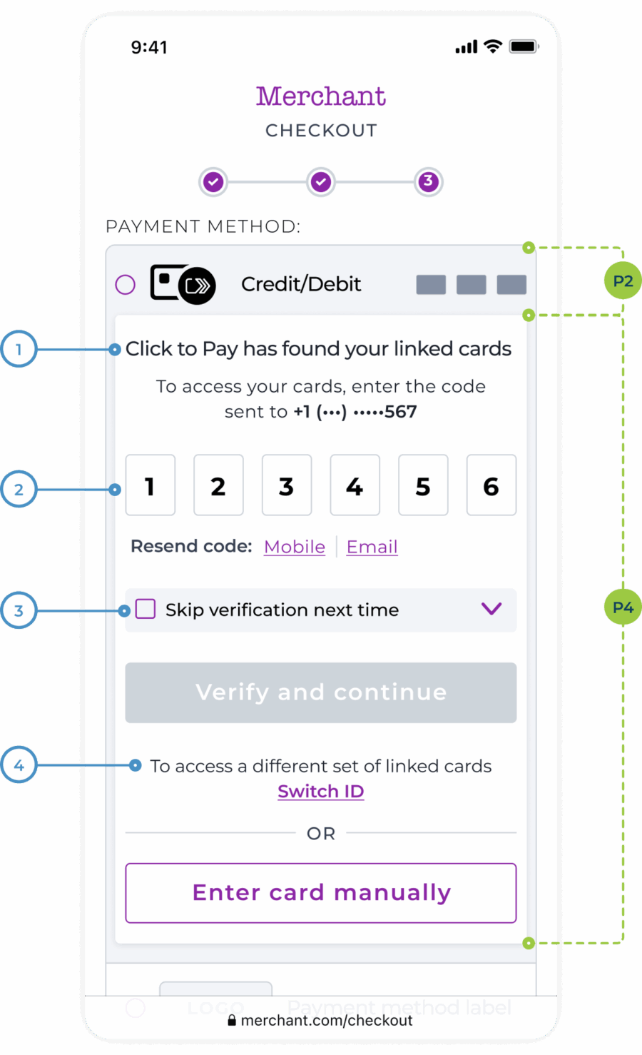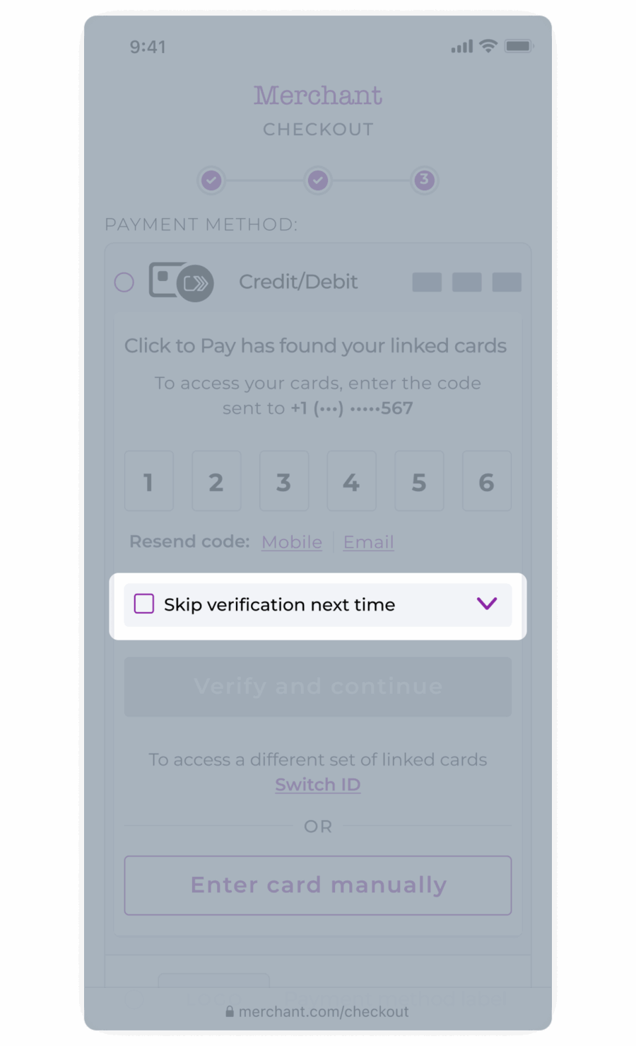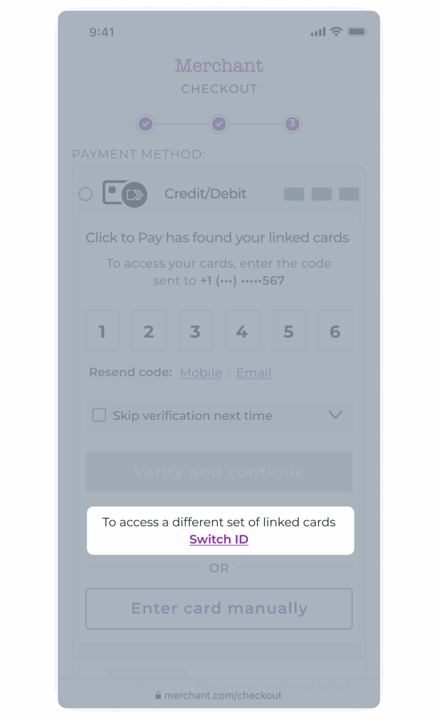 • Display the text “To access a different set of linked cards” below the “Verify and continue” button.