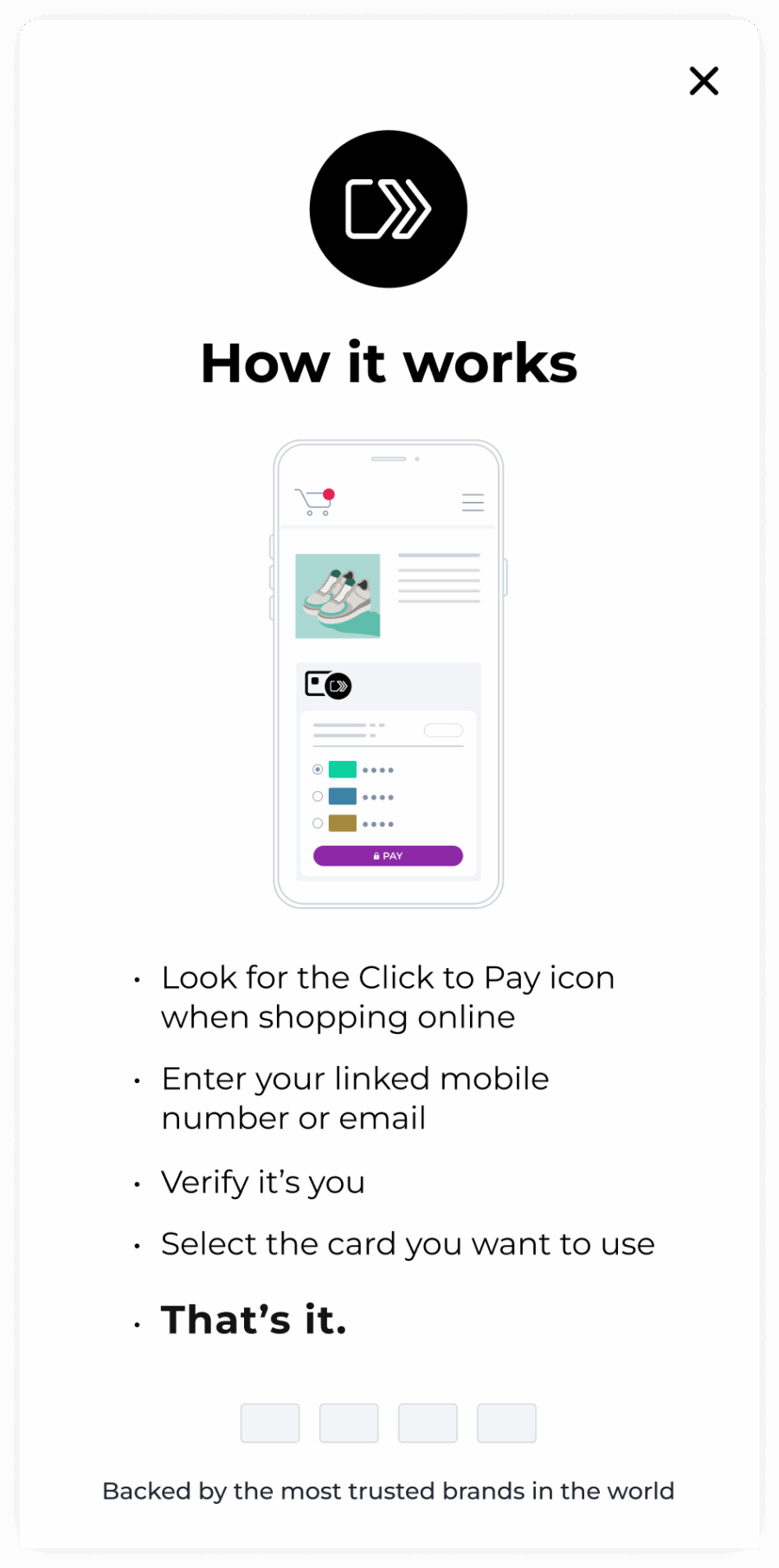 How the Click to Pay product education is displayed is determined by the merchant / PSP. It can be implemented as an overlay, action sheet or side panel.