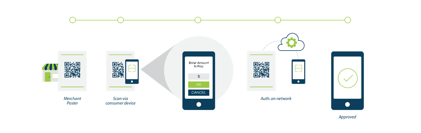 2. Merchant-presented QR Codes (MPM) is the other common experience for consumers. In this scenario, the merchant displays the QR code and the customer uses the camera on their mobile device to scan the code.